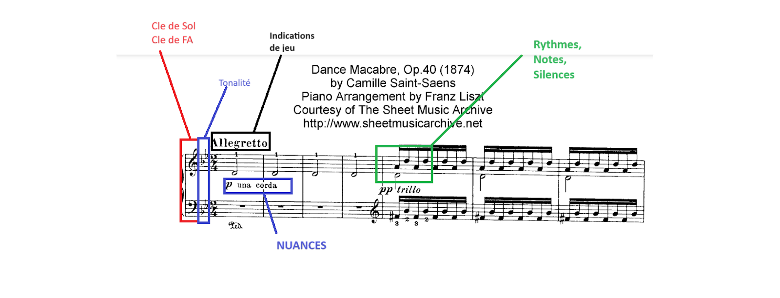 Tout d’abord les 7 notes (Do, ré, mi, fa, sol, la, si) qui sont réparties sur une portée contenant l’une des différentes clés permettant de lire les notes sur une partition. La plus connue étant la clé de sol.
